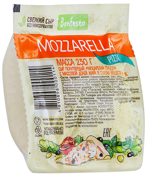 Сыр Моцарелла Пицца Бонфесто 40% 250г/6/БЗМЖ